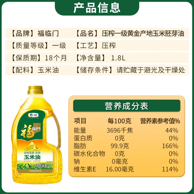 福临门 玉米油1.8升 压榨一级 福临门黄金产地玉米油 兑换价格 1700 里程 会员卡别 终身白金卡 白金卡 金卡 银卡 普通卡 儿童卡 服务 由 罗迪诺食品专营店 发货并提供售后 油品规格: 1.8L 购买数量: 件 库存件 配送地址: 立即购买 加入购物车 成功添加到购物车 关闭 购物车共有 种商品 总金额为: 组合销售 产品介绍 产品规格 售后服务 产品咨询 发现好货 长寿花 金胚玉米油食用油非转基因压榨一级 1.8L 2200 里程 珍佰粮菜籽油5L 5500 里程 福临门 一级大豆油900ML/瓶 优质家用食用油 1100 里程 福临门 家香味食用油 沂蒙土榨 花生仁油900ml 1600 里程 金龙鱼 浓香花生油5L 大桶装物理压榨一级厨房烹饪炒菜植物油粮油家庭食用油 浓香花生油食用油 5000 里程