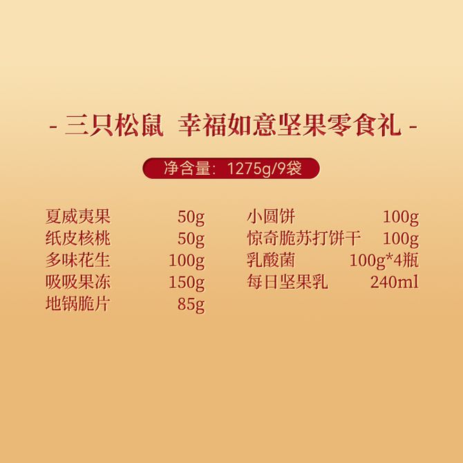 三只松鼠(Three Squirrels) 幸福如意88型坚果零食礼1275g/9袋 幸福如意88型坚果零食礼1275g/9袋 兑换价格 2300 里程 会员卡别 终身白金卡 白金卡 金卡 银卡 普通卡 儿童卡 服务 由 多宝商城 发货并提供售后 规格: 礼盒 购买数量: 件 库存件 配送地址: 立即购买 加入购物车 成功添加到购物车 关闭 购物车共有 种商品 总金额为: 组合销售 产品介绍 产品规格 售后服务 产品咨询 发现好货 西域美农 新疆薄皮核桃500g/袋 新疆特产原味 薄皮核桃 1300 里程 西域美农 烘焙腰果200g 坚果特产 休闲零食 带皮腰果仁 1600 里程 味滋源 紫皮腰果2袋装 每袋100g 1100 里程 沃隆每日坚果(A)175g盒装 1700 里程 百草味 坚果炒货夏威夷果100g*1袋 1100 里程