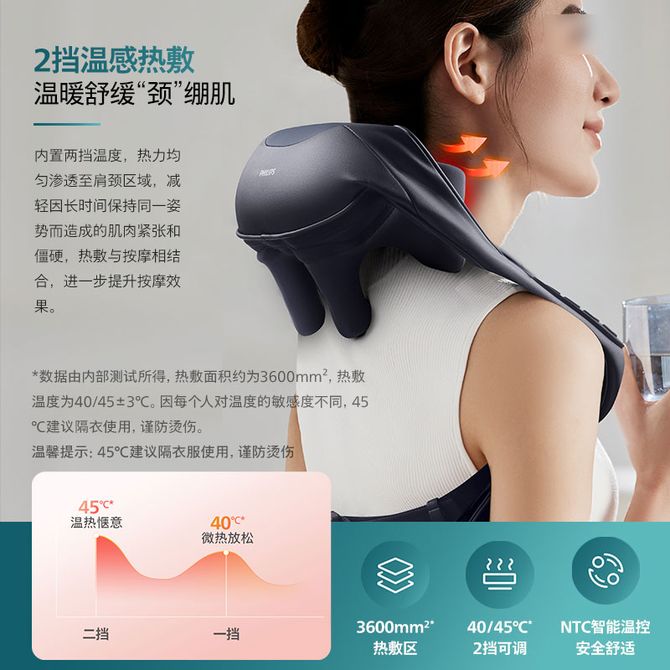 飞利浦/Philips 颈部按摩披肩颈部按摩仪肩颈颈椎按摩器热敷揉捏斜方肌按摩披肩送男女友生日礼物推荐 6大3D柔性按摩头,2 挡温感热敷,仿人手虎口八字抓揉 兑换价格 16100 里程 会员卡别 终身白金卡 白金卡 金卡 银卡 普通卡 儿童卡 服务 由 广西自贸区京通桂达科技发展有限公司 发货并提供售后 颜色: 其他 购买数量: 件 库存件 配送地址: 立即购买 加入购物车 成功添加到购物车 关闭 购物车共有 种商品 总金额为: 组合销售 产品介绍 产品规格 售后服务 产品咨询 发现好货 鹰伦 U型颈椎按摩仪SKT-Y8807 白色 3400 里程 亚摩斯/Amos 多功能筋膜枪 小巧轻盈携带方便智能 运动护理修复神器AS-JM256 3900 里程 践程JeoyCosy 脉冲颈椎按摩仪 热敷颈部按摩器 智能家用理疗肌肉放松健康护理肩颈护颈仪 3500 里程 SKG 筋膜枪便携按摩仪专业级筋膜枪肌肉按摩器全身颈椎肩颈腰腿运动 8700 里程 倍轻松(breo)眼部按摩器 眼睛按摩仪眼保仪 恒温热敷眼罩 EM 003 10400 里程
