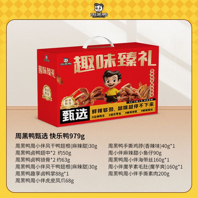 周黑鸭(ZHOUHaYA) 甄选 快乐鸭979g 甄选 快乐鸭979g 兑换价格 4800 里程 会员卡别 终身白金卡 白金卡 金卡 银卡 普通卡 儿童卡 服务 由 多宝商城 发货并提供售后 规格: 礼盒 购买数量: 件 库存件 配送地址: 立即购买 加入购物车 成功添加到购物车 关闭 购物车共有 种商品 总金额为: 组合销售 产品介绍 产品规格 售后服务 产品咨询 发现好货 蒙都 风干牛肉干 500g (原味/五香/孜然/香辣)下单备注口味 新老包装随机 7000 里程 蒙都 酱牛肉200g*2袋 卤牛肉 熟食 内蒙古特产 五香真空包装熟牛肉 4100 里程 百草味 白芝麻猪肉脯100g 休闲零食肉干肉脯 1100 里程 百草味 原切牛肉片50g*1袋 牛肉干休闲零食 特产小吃肉干 1500 里程 三只松鼠(Three Squirrels) 蜀香牛肉麻辣味肉脯即食卤味牛肉 100gx2袋 1300 里程