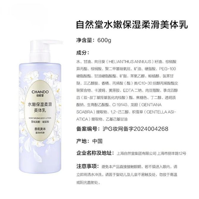 自然堂/Chando 水嫩柔滑身体乳600g保湿补水滋润皮肤干燥持久留香润肤乳 水嫩柔滑身体乳600g 兑换价格 2100 里程 会员卡别 终身白金卡 白金卡 金卡 银卡 普通卡 儿童卡 服务 由 本贝生活 发货并提供售后 化妆品容量: 600g/ml 购买数量: 件 库存件 配送地址: 立即购买 加入购物车 成功添加到购物车 关闭 购物车共有 种商品 总金额为: