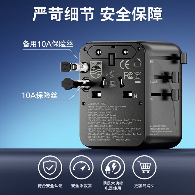 飞利浦/Philips 侧插转换插头 SPN1617B/93 全球通用45W快充含USB两口插头国际旅行插座 侧插转换插头 SPN1617B/93 全球通用45W快充含USB两口插头国际旅行插座 兑换价格 8700 里程 会员卡别 终身白金卡 白金卡 金卡 银卡 普通卡 儿童卡 服务 由 居多电器专营店 发货并提供售后 插排线: 无线 插位: 3插位 购买数量: 件 库存件 配送地址: 立即购买 加入购物车 成功添加到购物车 关闭 购物车共有 种商品 总金额为: 组合销售 产品介绍 产品规格 售后服务 产品咨询 发现好货 小米 多功能 3孔3USB插口 2A快充 防儿童使用安全设计插口电源插线板 白色 3000 里程 飞利浦/Philips 新国标分控插座/插线板/插板/接线板/拖线板 分控4位1.8米SPB3140WA/93 1800 里程 飞利浦/Philips 排插 1.8米总控插座 6位5孔插排 SPB2163WA/93 1500 里程 公牛(BULL) 插座新国标高品质插线3位总控全长1.8米安全保护门插线板插排排插接线板拖线板 1200 里程 公牛(BULL) 新国标插座4位总控开关全长1.8米GN-607 1600 里程