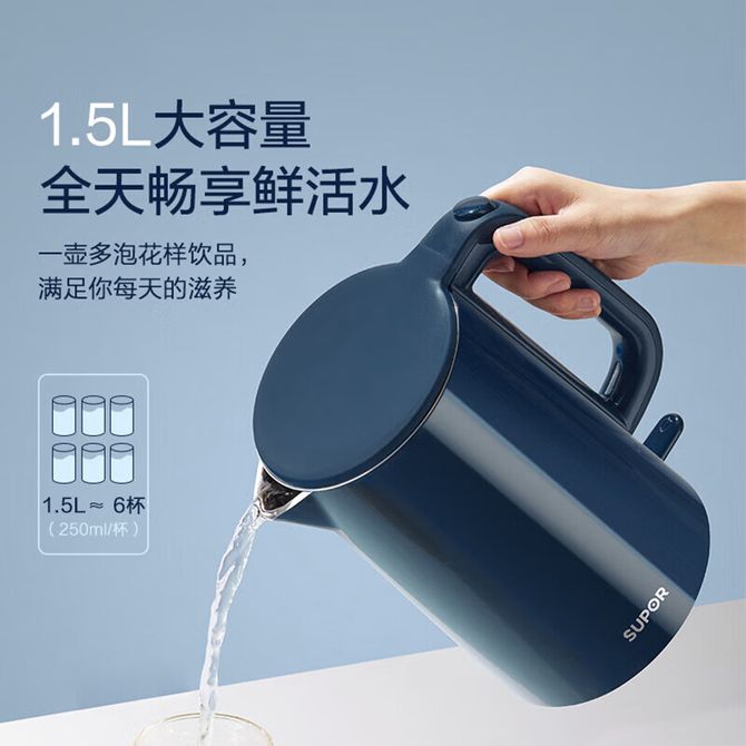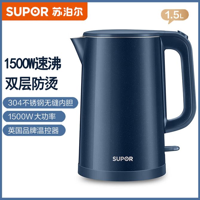 苏泊尔/Supor 电水壶 1.5L容量 双层防烫 304不锈钢无缝内胆安全饮水 防干烧 SW-15T101C 1.5L大容量;1500W速沸; 双层防烫; 兑换价格 4000 里程 会员卡别 终身白金卡 白金卡 金卡 银卡 普通卡 儿童卡 服务 由 小枫叶专营店 发货并提供售后 颜色: 蓝色 购买数量: 件 库存件 配送地址: 立即购买 加入购物车 成功添加到购物车 关闭 购物车共有 种商品 总金额为: 组合销售 产品介绍 产品规格 售后服务 产品咨询 发现好货 苏泊尔(SUPOR)电水壶 1.7L 不锈钢/YL SW-17S13A 5700 里程 志高/Chigo 电水壶烧水壶1.8L大容量电热水壶双层防烫自动断电家用烧水开水壶不锈钢 电水壶 DC-A18F 1900 里程 美的/Midea 电热水壶家用大容量烧水壶热水壶双层防烫电水壶304不锈钢内胆自动断电分离式拔盖 MK-SH15X1-102 3000 里程 小熊/Bear 电水壶家用烧水壶 不锈钢自动断电恒温热水壶保温一体电热水壶1.5L容量 3500 里程 小熊/Bear 烧水壶电水壶热水壶电热水壶开水壶304不锈钢内胆双层防烫1.5L大容量ZDH-Q15U8 3000 里程