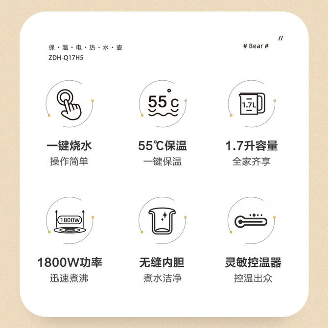 小熊/Bear 电水壶 家用1.7L大容量热水壶烧水壶 恒温水壶 一键保温 双层防烫 ZDH-Q17H5 55℃保温;1.7L容量;1800W功率; 兑换价格 4300 里程 会员卡别 终身白金卡 白金卡 金卡 银卡 普通卡 儿童卡 服务 由 小枫叶专营店 发货并提供售后 颜色: 米白色 购买数量: 件 库存件 配送地址: 立即购买 加入购物车 成功添加到购物车 关闭 购物车共有 种商品 总金额为: