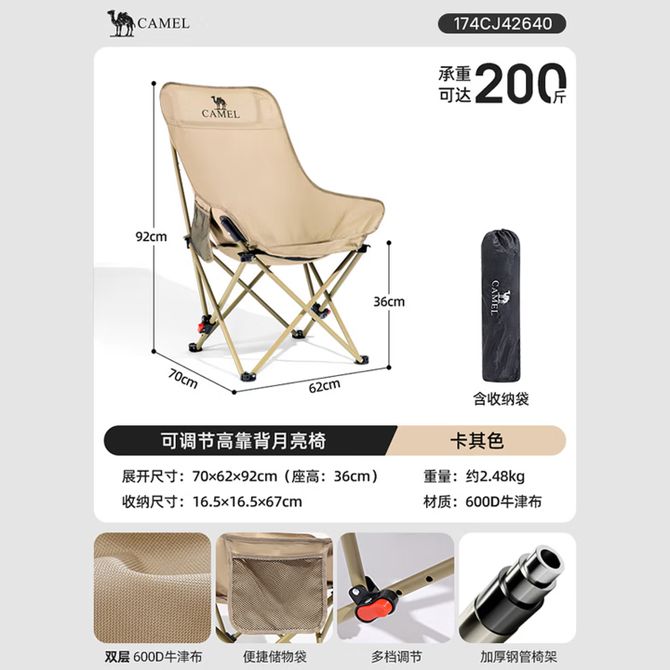 骆驼/Camel 户外折叠椅可调节月亮椅沙滩便携凳写生钓鱼高靠背椅子174CJ42640 三档调节 可坐可躺 折叠收纳 高靠背月亮椅 兑换价格 4400 里程 会员卡别 终身白金卡 白金卡 金卡 银卡 普通卡 儿童卡 服务 由 亿宇安百户外专营店 发货并提供售后 颜色: 黑色 卡其色 购买数量: 件 库存件 配送地址: 立即购买 加入购物车 成功添加到购物车 关闭 购物车共有 种商品 总金额为: