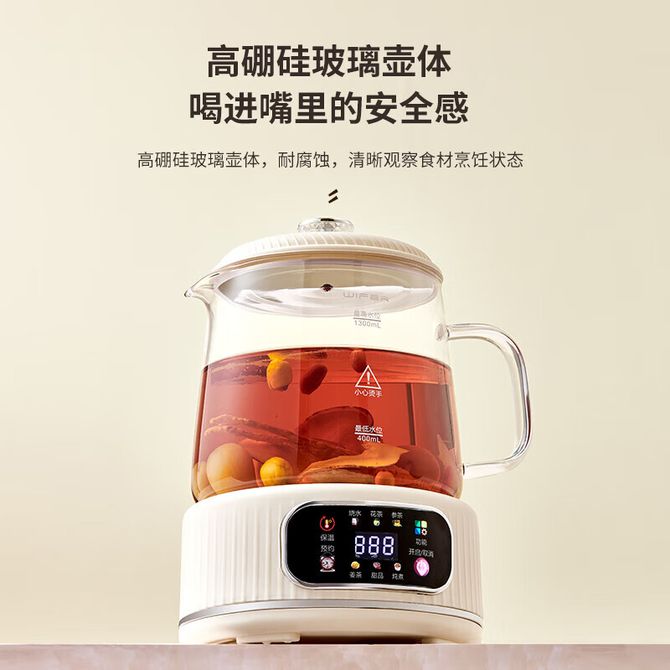 WIFER 全玻璃养生壶烧水壶保温炖煮壶一体全自动煮茶水壶2026年新款办公室家用迷你花茶壶恒温分体式茶壶配不锈钢茶漏 1.3L WIFER全玻璃养生壶 兑换价格 3700 里程 会员卡别 终身白金卡 白金卡 金卡 银卡 普通卡 儿童卡 服务 由 赛丹孚小家电专营店 发货并提供售后 颜色: 其他 购买数量: 件 库存件 配送地址: 立即购买 加入购物车 成功添加到购物车 关闭 购物车共有 种商品 总金额为: 组合销售 产品介绍 产品规格 售后服务 产品咨询 发现好货 九阳/Joyoung 养生壶1.5L茶具电茶壶煮茶壶花茶壶玻璃煮茶器煎药壶中药锅药膳电水壶烧水壶 3900 里程 九阳/Joyoung 养生壶迷你玻璃花茶壶煮茶器 12大功能11档温度 电水壶热水壶烧水壶 1.5L DGD1506BQ 3900 里程 美的/Midea 养生壶 1.5L家用多功能小型全自动办公室烧水壶加厚玻璃煮茶热水壶 MK-YS15P201 4200 里程 美的/Midea 养生壶 1.5L家用养生壶全自动玻璃烧水壶24h预约烧水壶12小时防干烧保护智能恒温 MK-YS15P202 3700 里程 美的/Midea 养生壶 1.5L全自动电热水壶 24h预约12小时智能恒温 14大功能11档控温 花茶壶煮茶器MK-Y12Q 3500 里程
