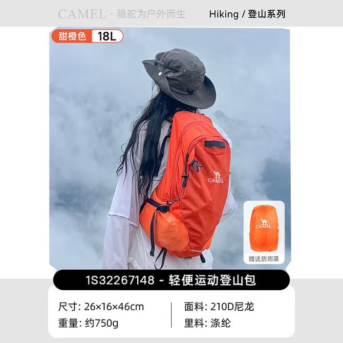 骆驼/Camel 破晓户外轻便徒步双肩包运动露营休闲旅行登山包 甜橙色 户外双肩包,徒步旅行、日常通勤,多场景适用 兑换价格 6500 里程 会员卡别 终身白金卡 白金卡 金卡 银卡 普通卡 儿童卡 服务 由 亿宇安百户外专营店 发货并提供售后 颜色: 橙色 购买数量: 件 库存件 配送地址: 立即购买 加入购物车 成功添加到购物车 关闭 购物车共有 种商品 总金额为: 组合销售 产品介绍 产品规格 售后服务 产品咨询 发现好货 匹克/PEAK 防泼水男女户外轻便旅行双肩运动登山背包10L YW41102 5400 里程 骆驼/Camel 户外双肩包男女徒步旅行运动登山包大容量轻便背包 3FI101C 【赠送登山杖1根】 13000 里程 TFO 北美系列户外登山包30L9202403F00 黑色 35L 17400 里程 TFO 登山户外背包 男女大容量轻便耐磨电脑仓 旅行骑行野营双肩包 蓝色 40L 9600 里程 驿客/EASTSKY 时尚户外通勤背包(黑色/灰色两色可选)EKB-8007 2200 里程