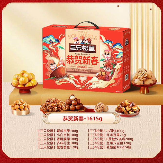 三只松鼠(Three Squirrels) 恭贺新春1615g 国货送礼好选择 恭贺新春1615g 兑换价格 4000 里程 会员卡别 终身白金卡 白金卡 金卡 银卡 普通卡 儿童卡 服务 由 多宝商城 发货并提供售后 规格: 礼盒 购买数量: 件 库存件 配送地址: 立即购买 加入购物车 成功添加到购物车 关闭 购物车共有 种商品 总金额为: 组合销售 产品介绍 产品规格 售后服务 产品咨询 发现好货 西域美农 新疆薄皮核桃500g/袋 新疆特产原味 薄皮核桃 1300 里程 西域美农 烘焙腰果200g 坚果特产 休闲零食 带皮腰果仁 1600 里程 味滋源 紫皮腰果2袋装 每袋100g 1100 里程 沃隆每日坚果(A)175g盒装 1700 里程 百草味 坚果炒货夏威夷果100g*1袋 1100 里程