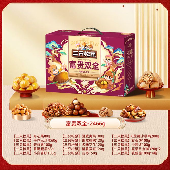 三只松鼠(Three Squirrels) 富贵双全2466g 富贵双全2466g 兑换价格 7200 里程 会员卡别 终身白金卡 白金卡 金卡 银卡 普通卡 儿童卡 服务 由 多宝商城 发货并提供售后 规格: 礼盒 购买数量: 件 库存件 配送地址: 立即购买 加入购物车 成功添加到购物车 关闭 购物车共有 种商品 总金额为: 组合销售 产品介绍 产品规格 售后服务 产品咨询 发现好货 西域美农 新疆薄皮核桃500g/袋 新疆特产原味 薄皮核桃 1300 里程 西域美农 烘焙腰果200g 坚果特产 休闲零食 带皮腰果仁 1600 里程 味滋源 紫皮腰果2袋装 每袋100g 1100 里程 沃隆每日坚果(A)175g盒装 1700 里程 百草味 坚果炒货夏威夷果100g*1袋 1100 里程