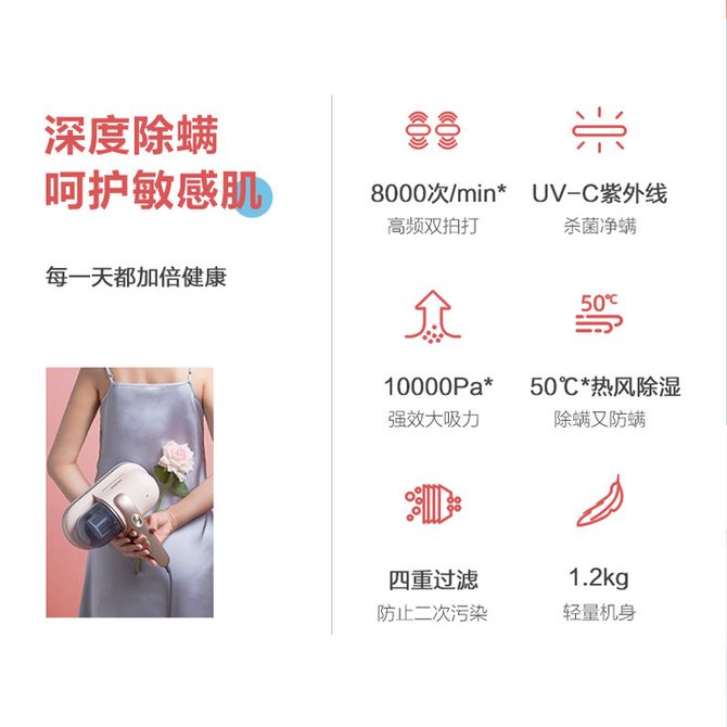 海尔/Haier 除螨仪 深度除螨呵护敏感肌热风除湿多重过滤强效杀菌除螨仪 8000次/min UV-C紫外线 高频双拍打 杀菌净螨 兑换价格 11300 里程 会员卡别 终身白金卡 白金卡 金卡 银卡 普通卡 儿童卡 服务 由 广西桂福礼供应链管理有限公司 发货并提供售后 颜色: 粉色 购买数量: 件 库存件 配送地址: 立即购买 加入购物车 成功添加到购物车 关闭 购物车共有 种商品 总金额为: 组合销售 产品介绍 产品规格 售后服务 产品咨询 发现好货 奥克斯 家用吸尘器家用吸拖一体机吸尘器家用有线手持车载大吸力吸尘器清洁宠物小型多用除尘AXS-527 至尊版 6100 里程 小米 米家除螨仪 家用手持除螨机 床上去螨虫 大吸力热风除湿 MJCMY01DY 12500 里程 小米 米家随手吸尘器 车载居家两用 手持无线轻盈便携 13000 里程 海尔(Haier) 家用吸尘器 有线手持小型推杆大吸力 可视化尘杯 二合一强劲纤薄机身除尘 手持吸尘器HT-C2160B升级 7400 里程 小米 无线手持吸尘器2 Lite家用中小型大吸力无刷电机除螨清洁 21300 里程