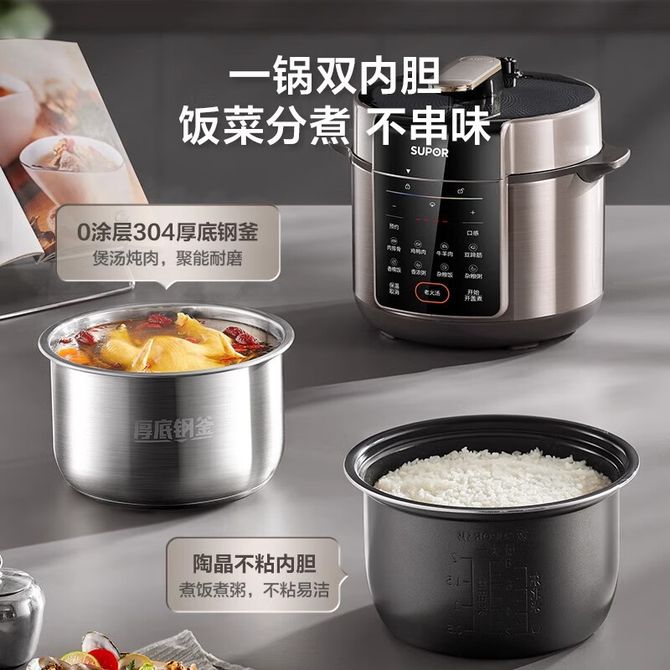 组合销售 产品介绍 产品规格 售后服务 产品咨询 发现好货 苏泊尔(SUPOR)电压力锅 6升大容量 智能触控 球釜双胆 开盖收汁 一键排压 SY-60YC8001Q 高压锅 16900 里程 美的/Midea 电压力锅家用5L大容量多功能高压锅双胆一键收汁智能预约不粘电高压锅电饭锅煮粥煲汤锅 一锅双胆【一键收汁入味】 YL50M1-702 10600 里程 苏泊尔(SUPOR) 5L电压力锅家用电高压锅双胆高压电饭锅煮饭智能预约 SY-50YC8186 11300 里程 美的/Midea 电压力锅 【一锅双胆】5L全自动家用智能预约 上蒸下煮 不粘双胆煲汤炖肉 YL50Q3-451 10900 里程 美的/Midea 电压力锅 高压锅家用电压力煲智能预约电饭煲大容量多功能定时预约电饭煲3-8人单胆旋钮款4L MY-E4809 8700 里程