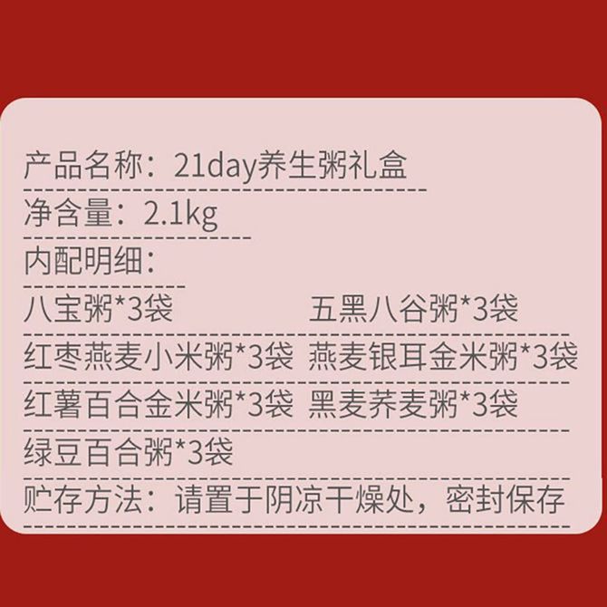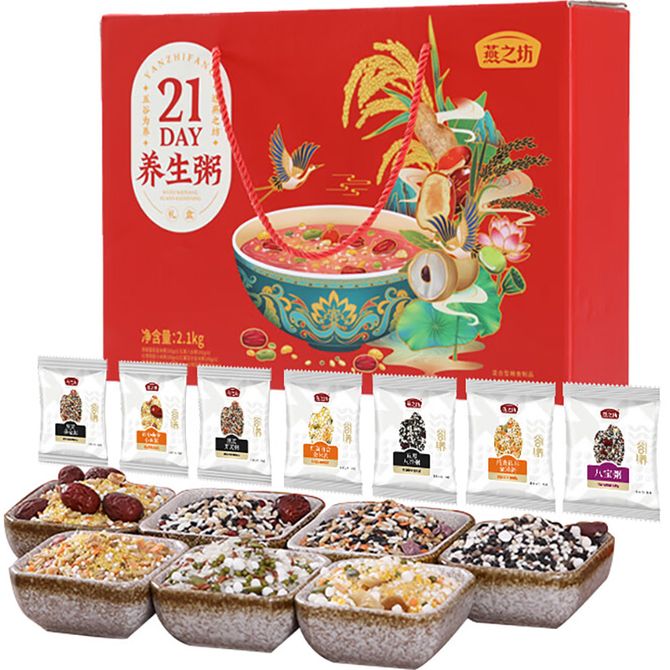 燕之坊 21day养生粥礼盒2.1kg 7种口味21小包装粥料 五谷杂粮粥米营养早餐多种粥料礼盒 八宝粥*3袋,五黑八谷粥*3袋,红枣燕麦小米粥*3袋,燕麦银耳金米粥*3袋,红薯百合金米粥*3袋,黑麦荞麦粥*3袋,绿豆百合粥*3袋 兑换价格 2900 里程 会员卡别 终身白金卡 白金卡 金卡 银卡 普通卡 儿童卡 服务 由 清益食品专营店 发货并提供售后 规格: 礼盒 购买数量: 件 库存件 配送地址: 立即购买 加入购物车 成功添加到购物车 关闭 购物车共有 种商品 总金额为: 组合销售 产品介绍 产品规格 售后服务 产品咨询 发现好货 金熊 泰国茉莉 香米 1kg 泰国原料进口 1300 里程 十月稻田当季新米辽河长粒香大米 5kg 东北大米 香米 粳米 十斤 2100 里程 源头说 五常有机稻花香新米 东北大米 2.5kg(双重防伪认证) 4200 里程 十月稻田 长粒香大米2.5kg 东北大米5斤 东北香米 1300 里程 稻可道雪地黑土东北珍珠大米5kg 1600 里程