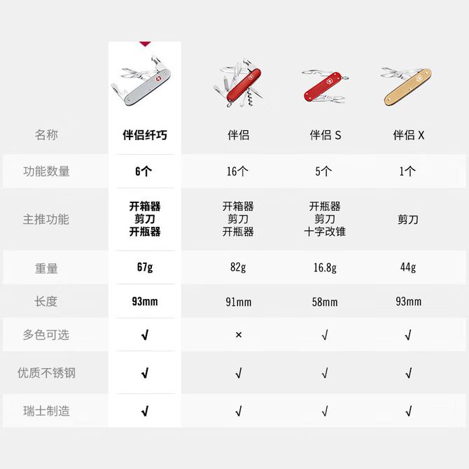 维氏(VICTORINOX) 瑞士军刀 铝面新艺系列 伴侣纤巧(6项功能)0.8170 三色可选、6项功能、瑞士进口 兑换价格 10300 里程 会员卡别 终身白金卡 白金卡 金卡 银卡 普通卡 儿童卡 服务 由 至恩户外运动专营店 发货并提供售后 颜色: 红色 金色 银色 购买数量: 件 库存件 配送地址: 立即购买 加入购物车 成功添加到购物车 关闭 购物车共有 种商品 总金额为: