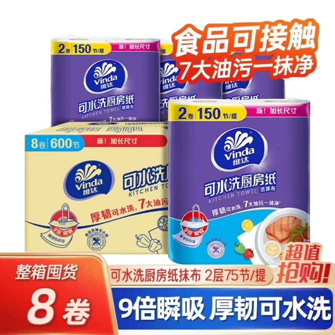维达 厨房卷纸可水洗75节加厚懒人抹布 厨房用纸 V4020-2 下单规格:2提=4卷,4提=8卷(新老包装随机发货) 兑换价格 1100-1600 里程 会员卡别 终身白金卡 白金卡 金卡 银卡 普通卡 儿童卡 服务 由 甜蜜生活馆 发货并提供售后 包装数量: 2提 4提 购买数量: 件 库存件 配送地址: 立即购买 加入购物车 成功添加到购物车 关闭 购物车共有 种商品 总金额为: 组合销售 产品介绍 产品规格 售后服务 产品咨询 发现好货 维达卷纸 卫生纸实惠装厕纸家用厕所纸巾手纸整箱批有芯大卷家庭装 1200-2300 里程 维达 Vinda 卷纸 140g/卷*10卷 蓝色经典3层卫生纸 1300 里程 心相印抽纸 茶语丝享系列 量贩家庭装 3层*100抽*4包(茶香 压花) 1100 里程 心相印 经典系列 二层面巾纸 180抽*6包*1提 1100 里程 维达Vinda 超韧系列抽纸(3层*130抽*6包) 原生木浆卫生餐巾纸婴儿面巾纸 6包优惠装 1100 里程
