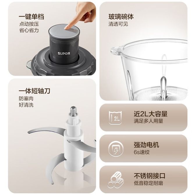 苏泊尔(SUPOR) 绞肉机绞馅机碎肉机玻璃大容量搅拌机切菜机碎肉馅菜馅单双刀搅拌机 灰色 1.75L 双刀头JR20S-B175 短轴双刀头|6s速绞|一键操作|2升大容量 兑换价格 4800 里程 会员卡别 终身白金卡 白金卡 金卡 银卡 普通卡 儿童卡 服务 由 优米酷家电生活馆 发货并提供售后 颜色: 其他 购买数量: 件 库存件 配送地址: 立即购买 加入购物车 成功添加到购物车 关闭 购物车共有 种商品 总金额为: