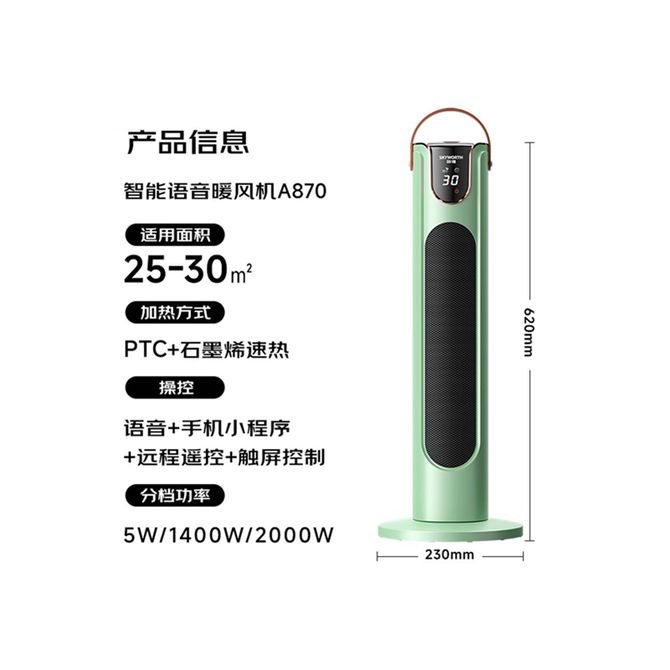 创维/Skyworth A870智能语音石墨烯取暖器家用暖风机电热取暖器电暖器 纳米石墨烯3秒速热 AI智能控制 60°摇头 12H定时 兑换价格 23000 里程 会员卡别 终身白金卡 白金卡 金卡 银卡 普通卡 儿童卡 服务 由 弘济家电 发货并提供售后 颜色: 白色 绿色 购买数量: 件 库存件 配送地址: 立即购买 加入购物车 成功添加到购物车 关闭 购物车共有 种商品 总金额为: