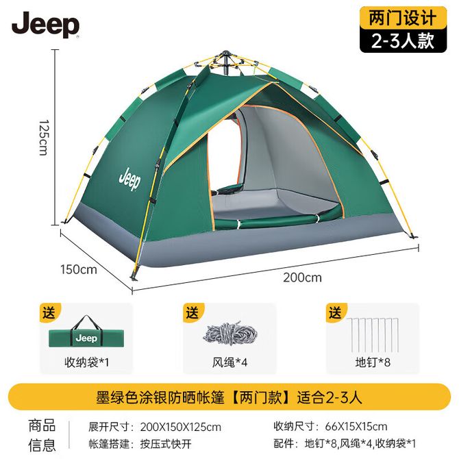 Jeep 帐篷户外露营用品装备全自动速开便携折叠野营野外防风雨帐篷四角帐篷【两门款】 Jeep四角帐篷两门款 兑换价格 8700 里程 会员卡别 终身白金卡 白金卡 金卡 银卡 普通卡 儿童卡 服务 由 赛丹孚运动户外专营店 发货并提供售后 颜色: 米白色 墨绿色 购买数量: 件 库存件 配送地址: 立即购买 加入购物车 成功添加到购物车 关闭 购物车共有 种商品 总金额为: