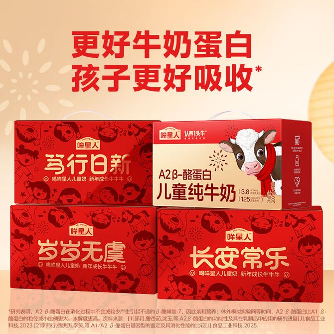 认养一头牛ADOPT A COW 3.8g蛋白全脂纯牛奶年货礼盒 200mL*10盒 *2箱 哞星人A2β-酪蛋白全脂纯牛奶 新老包装随机发货 兑换价格 3500 里程 会员卡别 终身白金卡 白金卡 金卡 银卡 普通卡 儿童卡 服务 由 凯赋甄选 发货并提供售后 规格: 礼盒 购买数量: 件 库存件 配送地址: 立即购买 加入购物车 成功添加到购物车 关闭 购物车共有 种商品 总金额为: 组合销售 产品介绍 产品规格 售后服务 产品咨询 发现好货 蒙牛 特仑苏纯牛奶苗条装250ml×12盒 2900 里程 三元 经典小方白全脂纯牛奶250ml*24盒牛奶 整箱 3400 里程 伊利金典纯牛奶250ml*12盒整箱 2200 里程 伊利 金典纯牛奶整箱 250ml*12盒 3.6g乳蛋白 原生高钙 礼盒装 1800 里程 伊利 伊利 金典纯牛奶整箱250ml*12盒 3.6g乳蛋白 早餐搭档 2000 里程