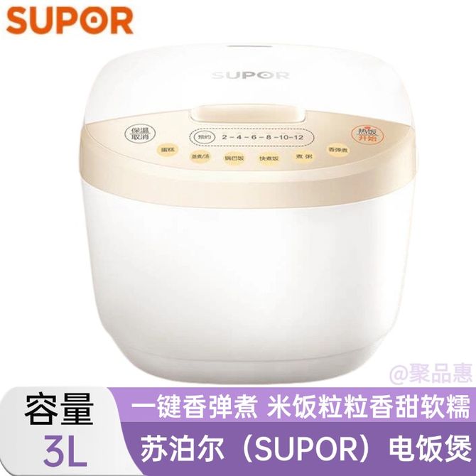 苏泊尔(SUPOR) 电饭煲3L智能预约多功能迷你电饭锅精煮柴火饭 3L容量 一键香弹煮 微压烹饪 兑换价格 11700 里程 会员卡别 终身白金卡 白金卡 金卡 银卡 普通卡 儿童卡 服务 由 聚品惠家电生活馆 发货并提供售后 颜色: 其他 购买数量: 件 库存件 配送地址: 立即购买 加入购物车 成功添加到购物车 关闭 购物车共有 种商品 总金额为: