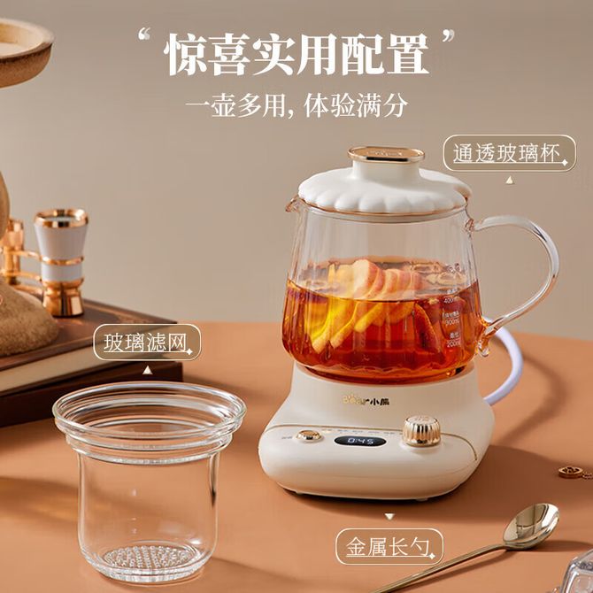 小熊/Bear 全玻璃0胶0拼接养生壶迷你养生杯0.4升煮茶壶煮茶器YSH-E04L1 全玻璃壶体 滤网 兑换价格 6500 里程 会员卡别 终身白金卡 白金卡 金卡 银卡 普通卡 儿童卡 服务 由 酷宝电器专营店 发货并提供售后 颜色: 米黄色 购买数量: 件 库存件 配送地址: 立即购买 加入购物车 成功添加到购物车 关闭 购物车共有 种商品 总金额为: 组合销售 产品介绍 产品规格 售后服务 产品咨询 发现好货 九阳/Joyoung 养生壶1.5L茶具电茶壶煮茶壶花茶壶玻璃煮茶器煎药壶中药锅药膳电水壶烧水壶 3900 里程 美的/Midea 养生壶 1.5L家用多功能小型全自动办公室烧水壶加厚玻璃煮茶热水壶 MK-YS15P201 4200 里程 九阳/Joyoung 养生壶迷你玻璃花茶壶煮茶器 12大功能11档温度 电水壶热水壶烧水壶 1.5L DGD1506BQ 3900 里程 美的/Midea 养生壶 1.5L全自动电热水壶 24h预约12小时智能恒温 14大功能11档控温 花茶壶煮茶器MK-Y12Q 3500 里程 小熊/Bear 养生壶电热水壶煮茶器烧水壶家用1.5L煮茶壶全自动保温多功能电水壶花果茶壶YSH-C15W1 3900 里程