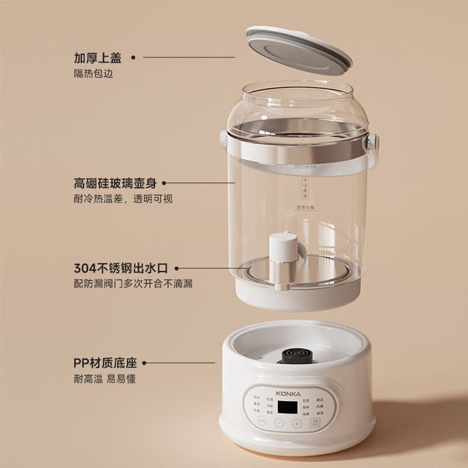 康佳/Konka 养生壶水龙头花茶桶聚会3L大容量烧水壶煮热水壶多功能煮茶壶果茶桶便捷出水高硼硅玻璃 3L大容量 24H预约 便捷出水 高硼硅玻璃 兑换价格 7800 里程 会员卡别 终身白金卡 白金卡 金卡 银卡 普通卡 儿童卡 服务 由 广西自贸区京通桂达科技发展有限公司 发货并提供售后 颜色: 其他 购买数量: 件 库存件 配送地址: 立即购买 加入购物车 成功添加到购物车 关闭 购物车共有 种商品 总金额为: 组合销售 产品介绍 产品规格 售后服务 产品咨询 发现好货 九阳/Joyoung 养生壶1.5L茶具电茶壶煮茶壶花茶壶玻璃煮茶器煎药壶中药锅药膳电水壶烧水壶 3900 里程 九阳/Joyoung 养生壶迷你玻璃花茶壶煮茶器 12大功能11档温度 电水壶热水壶烧水壶 1.5L DGD1506BQ 3900 里程 美的/Midea 养生壶 1.5L家用多功能小型全自动办公室烧水壶加厚玻璃煮茶热水壶 MK-YS15P201 4200 里程 美的/Midea 养生壶 1.5L家用养生壶全自动玻璃烧水壶24h预约烧水壶12小时防干烧保护智能恒温 MK-YS15P202 3700 里程 美的/Midea 养生壶 1.5L全自动电热水壶 24h预约12小时智能恒温 14大功能11档控温 花茶壶煮茶器MK-Y12Q 3500 里程