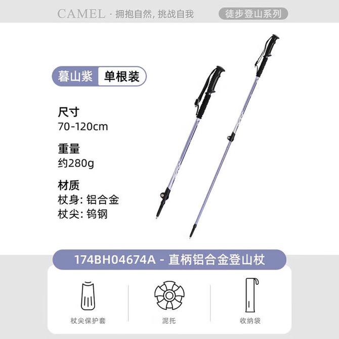 骆驼/Camel 户外登山直柄手杖轻便伸缩折叠徒步防滑拐杖 174BH04674 暮山紫 直柄铝合金登山杖,需要其它型号颜色请联系客服 兑换价格 2100 里程 会员卡别 终身白金卡 白金卡 金卡 银卡 普通卡 儿童卡 服务 由 亿宇安百户外专营店 发货并提供售后 颜色: 紫色 购买数量: 件 库存件 配送地址: 立即购买 加入购物车 成功添加到购物车 关闭 购物车共有 种商品 总金额为: