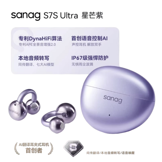 sanag 塞那S7S Ultra耳夹式蓝牙耳机 AI翻译 录音转写语音唤醒 HIFI动态音质 华为小米苹果通用 原装正品,1年质保 兑换价格 24600 里程 会员卡别 终身白金卡 白金卡 金卡 银卡 普通卡 儿童卡 服务 由 会天伦3C专营店 发货并提供售后 颜色: 白色 黑色 香槟色 紫色 购买数量: 件 库存件 配送地址: 立即购买 加入购物车 成功添加到购物车 关闭 购物车共有 种商品 总金额为: