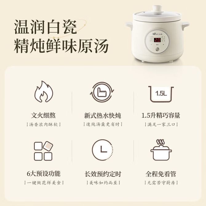 小熊/Bear 电炖锅 DDG-E15K2 迷你1.5L 智能预约定时煲汤锅 兑换价格 4800 里程 会员卡别 终身白金卡 白金卡 金卡 银卡 普通卡 儿童卡 服务 由 锦宁家电馆 发货并提供售后 颜色: 其他 购买数量: 件 库存件 配送地址: 立即购买 加入购物车 成功添加到购物车 关闭 购物车共有 种商品 总金额为: 组合销售 产品介绍 产品规格 售后服务 产品咨询 发现好货 小熊/Bear 电炖锅1-2人小炖锅煮粥锅智能预约定时煲汤锅炖汤锅燕窝炖盅 4400 里程 苏泊尔(SUPOR) 电火锅家用不粘煎涮炖煮多功能4L大容量一体式大火力电煮锅不粘煎涮炖煮多功能料理锅 H40YK757 5700 里程 西屋/Westinghouse 多功能电煮锅电炖锅1.6L一锅多能WFB16A 11600 里程 苏泊尔(SUPOR) 电火锅 宿舍小电锅学生寝室一体泡面小火锅 多功能锅涮肉涮菜 1.7L 【 单锅】H17YK489 3000 里程 小熊(Bear)电炖锅电炖盅煮粥神器煲汤锅炖汤锅婴儿煮粥锅熬粥燕窝炖盅DDG-E15K2 4800 里程