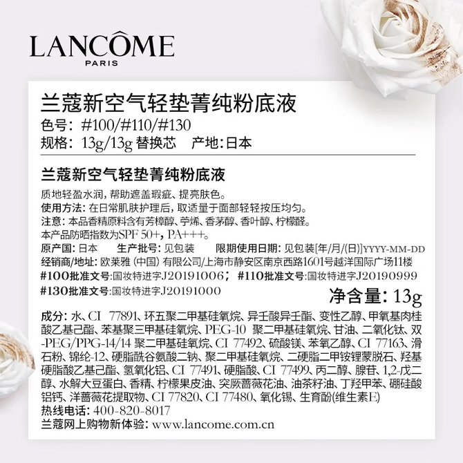 兰蔻 菁纯气垫#100粉白皮 13g 兰蔻新空气轻垫菁纯粉底液 100 原装正品 兑换价格 34400 里程 会员卡别 终身白金卡 白金卡 金卡 银卡 普通卡 儿童卡 服务 由 恩伊美妆 发货并提供售后 底妆分类: 粉底液/膏/霜 颜色: 其他 购买数量: 件 库存件 配送地址: 立即购买 加入购物车 成功添加到购物车 关闭 购物车共有 种商品 总金额为: