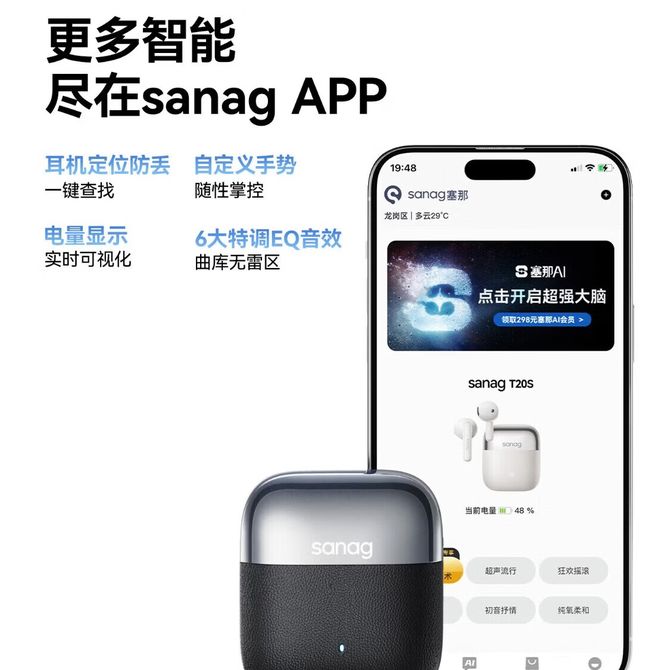 赛那/sanag 半入耳式蓝牙耳机 通话降噪游戏耳机超长续航久戴不痛 S-T20S 雅致皮纹×质感电镀 久戴舒适贴合 兑换价格 7000 里程 会员卡别 终身白金卡 白金卡 金卡 银卡 普通卡 儿童卡 服务 由 成都市澳杰森贸易有限公司 发货并提供售后 颜色: 白色 黑色 购买数量: 件 库存件 配送地址: 立即购买 加入购物车 成功添加到购物车 关闭 购物车共有 种商品 总金额为: