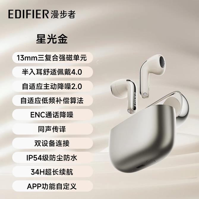 漫步者/EDIFIER 萝莉豆主动降噪蓝牙耳机 半入耳HiFi音质耳麦 同声传译久续航音乐耳塞Lolli ANC-星光金