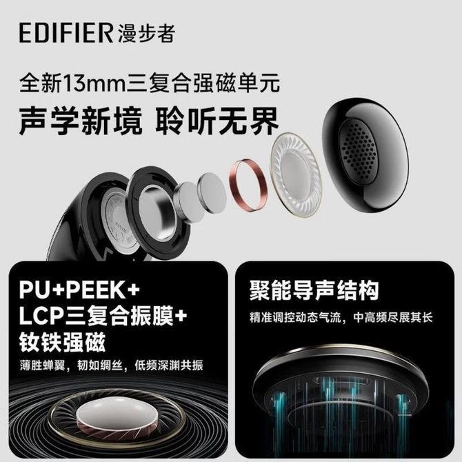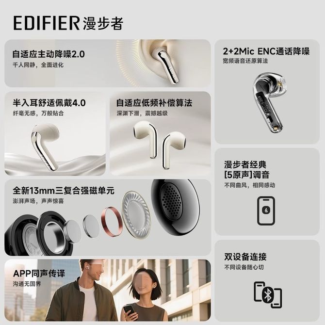 自适应主动降噪,三复合强磁喇叭,HiFi音质震撼低频,同声传译,4唛通话降噪,长效续航