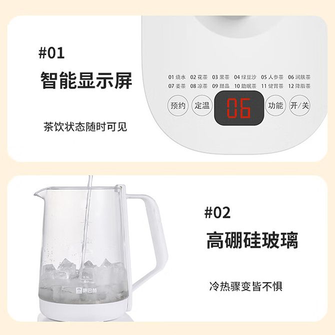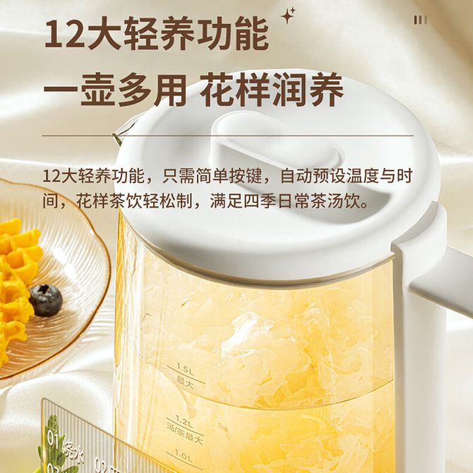 组合销售 产品介绍 产品规格 售后服务 产品咨询 发现好货 九阳/Joyoung 养生壶1.5L茶具电茶壶煮茶壶花茶壶玻璃煮茶器煎药壶中药锅药膳电水壶烧水壶 3900 里程 九阳/Joyoung 养生壶迷你玻璃花茶壶煮茶器 12大功能11档温度 电水壶热水壶烧水壶 1.5L DGD1506BQ 3900 里程 美的/Midea 养生壶 1.5L家用多功能小型全自动办公室烧水壶加厚玻璃煮茶热水壶 MK-YS15P201 4200 里程 美的/Midea 养生壶 1.5L家用养生壶全自动玻璃烧水壶24h预约烧水壶12小时防干烧保护智能恒温 MK-YS15P202 3700 里程 美的/Midea 养生壶 1.5L全自动电热水壶 24h预约12小时智能恒温 14大功能11档控温 花茶壶煮茶器MK-Y12Q 3500 里程