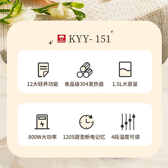 康巴赫 养生壶 智能变频调控一壶多用花样润养悦享养生壶多功能养生壶 12大轻养功能 食品级304发热盘 1.5L大容量 800W大功率 4段温度可调 120S提壶断电记忆 兑换价格 6100 里程 会员卡别 终身白金卡 白金卡 金卡 银卡 普通卡 儿童卡 服务 由 广西桂福礼供应链管理有限公司 发货并提供售后 颜色: 其他 购买数量: 件 库存件 配送地址: 立即购买 加入购物车 成功添加到购物车 关闭 购物车共有 种商品 总金额为: 组合销售 产品介绍 产品规格 售后服务 产品咨询 发现好货 九阳/Joyoung 养生壶1.5L茶具电茶壶煮茶壶花茶壶玻璃煮茶器煎药壶中药锅药膳电水壶烧水壶 3900 里程 九阳/Joyoung 养生壶迷你玻璃花茶壶煮茶器 12大功能11档温度 电水壶热水壶烧水壶 1.5L DGD1506BQ 3900 里程 美的/Midea 养生壶 1.5L家用多功能小型全自动办公室烧水壶加厚玻璃煮茶热水壶 MK-YS15P201 4200 里程 美的/Midea 养生壶 1.5L家用养生壶全自动玻璃烧水壶24h预约烧水壶12小时防干烧保护智能恒温 MK-YS15P202 3700 里程 美的/Midea 养生壶 1.5L全自动电热水壶 24h预约12小时智能恒温 14大功能11档控温 花茶壶煮茶器MK-Y12Q 3500 里程