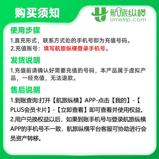 航旅纵横 PLUS会员年卡(返利版) 官方直充 限时享受1项开卡礼遇 联系方式处填写航旅纵横登录手机号充值即可 兑换价格 6700 里程 会员卡别 终身白金卡 白金卡 金卡 银卡 普通卡 儿童卡 服务 由 橙券生活服务专营店 发货并提供售后 卡券规格: 单张 购买数量: 件 库存件 立即购买 成功添加到购物车 关闭 购物车共有 种商品 总金额为: 组合销售 产品介绍 产品规格 售后服务 产品咨询 发现好货 小米影视会员 半年卡 小米电视影视会员半年卡 直充 7000 里程 航旅纵横 PLUS会员年卡(返利版) 官方直充 限时享受1项开卡礼遇 6700 里程