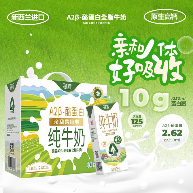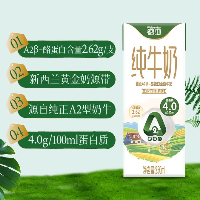 德亚/Weidendorf A2β-酪蛋白全脂牛奶250ML*10 礼盒装 新西兰进口全脂纯牛奶 天然牧场草饲,新西兰黄金奶源 兑换价格 2600 里程 会员卡别 终身白金卡 白金卡 金卡 银卡 普通卡 儿童卡 服务 由 壮乡优品生活馆 发货并提供售后 规格: 礼盒 购买数量: 件 库存件 配送地址: 立即购买 加入购物车 成功添加到购物车 关闭 购物车共有 种商品 总金额为: 组合销售 产品介绍 产品规格 售后服务 产品咨询 发现好货 蒙牛 特仑苏纯牛奶苗条装250ml×12盒 2900 里程 三元 经典小方白全脂纯牛奶250ml*24盒牛奶 整箱 3400 里程 伊利金典纯牛奶250ml*12盒整箱 2200 里程 伊利 金典纯牛奶整箱 250ml*12盒 3.6g乳蛋白 原生高钙 礼盒装 1800 里程 特仑苏 新日期纯牛奶250ml*12盒 3.6g乳蛋白 礼盒装 京东/顺丰发货 2400 里程