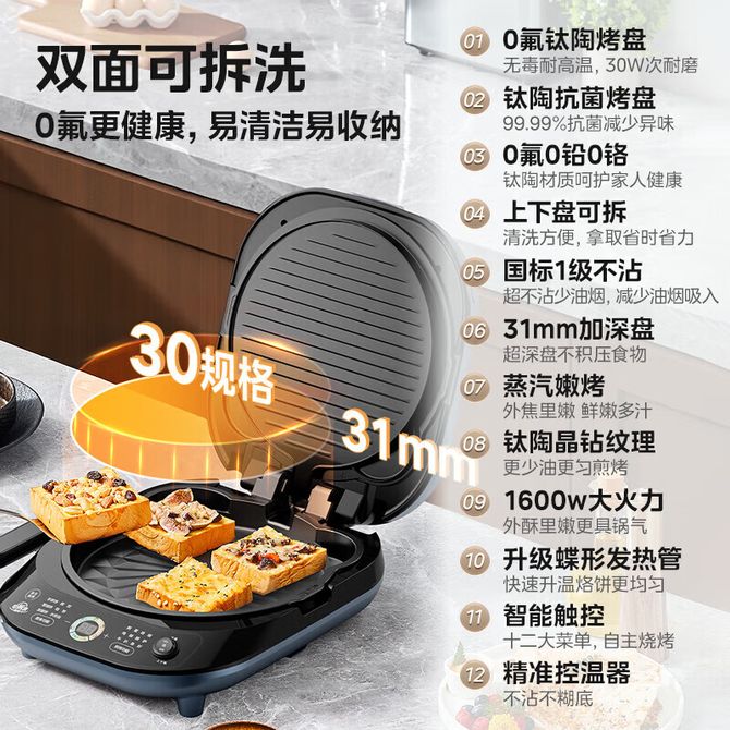 组合销售 产品介绍 产品规格 售后服务 产品咨询 发现好货 苏泊尔(SUPOR)电饼铛家用 双面加热煎饼铛煎烤机三明治机烙饼锅早餐机25mm加深烤盘火力可调JD31A847A 6500 里程 苏泊尔(SUPOR) 电饼铛 自动煎烤机 电火锅多功能 加大加深60mm双加热烙饼 锅面煎饼电饼档 两档火力 JT30A818 5700 里程 苏泊尔(SUPOR)电饼铛家用双面加热电饼档煎烤机烙饼机双面悬浮加热早餐机三明治机JJ30A648-Q 5700 里程 美的(Midea)电饼铛家用智能双面加热煎烤机烙饼机蛋饼机薄饼机煎饼烙饼锅JHN30F 4800 里程 奥克斯 电饼铛家庭用新款双面加热加大尺寸加深烤盘烙饼专用锅自动控温断电煎饼锅早餐机 5200 里程