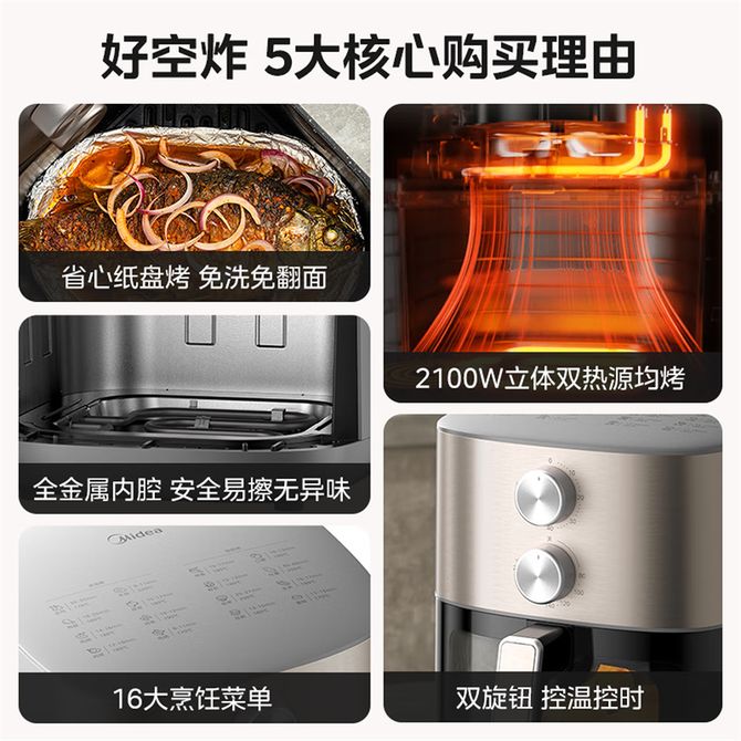 组合销售 产品介绍 产品规格 售后服务 产品咨询 发现好货 苏泊尔(SUPOR)空气炸锅 家用多功能4.2L大容量 烤箱薯条机 无油烟电炸锅 大功率 无油低脂煎炸锅KJ42D811 6500 里程 苏泊尔(SUPOR)空气炸锅家用3L大容量电炸锅 蒸汽嫩炸多功能无油烟煎炸薯条机烤箱KD30DQ815 21700 里程 美的/Midea 空气炸锅 家用5升可视炸锅金属内腔体微蒸汽多功能智能双旋控温电炸锅 KZE5089 10900 里程 美的/Midea 空气炸锅 可视 不用翻面 金属内腔 蒸汽嫩炸 三档烘烤风力 5L KZC5089 10700 里程 小熊/Bear 空气炸锅 4D漩烤不用翻面 全自动 5L实用大容量 可视 蒸汽嫩炸 控油脱脂 炸烤箱一体机 9100 里程