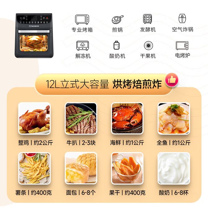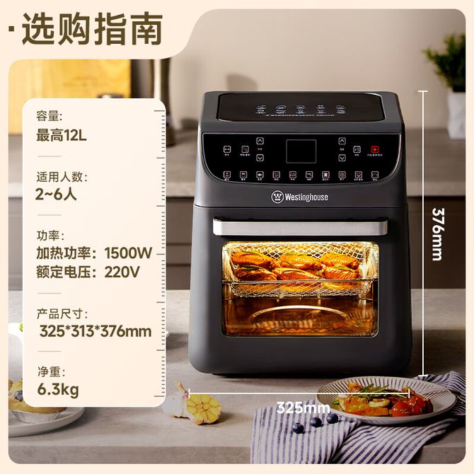 西屋/Westinghouse 空气炸锅12L容量烤炸一体轻脂少油家用多功能空气炸电炸锅3D热风循环空气炸烤箱 12L容量 3D热风循环 烤炸一体 九大预设菜单 兑换价格 26100 里程 会员卡别 终身白金卡 白金卡 金卡 银卡 普通卡 儿童卡 服务 由 广西自贸区京通桂达科技发展有限公司 发货并提供售后 颜色: 其他 购买数量: 件 库存件 配送地址: 立即购买 加入购物车 成功添加到购物车 关闭 购物车共有 种商品 总金额为: 组合销售 产品介绍 产品规格 售后服务 产品咨询 发现好货 苏泊尔(SUPOR)空气炸锅 家用多功能4.2L大容量 烤箱薯条机 无油烟电炸锅 大功率 无油低脂煎炸锅KJ42D811 6500 里程 苏泊尔(SUPOR)空气炸锅家用3L大容量电炸锅 蒸汽嫩炸多功能无油烟煎炸薯条机烤箱KD30DQ815 21700 里程 美的/Midea 空气炸锅 家用5升可视炸锅金属内腔体微蒸汽多功能智能双旋控温电炸锅 KZE5089 10900 里程 美的/Midea 空气炸锅 可视 不用翻面 金属内腔 蒸汽嫩炸 三档烘烤风力 5L KZC5089 10700 里程 小熊/Bear 空气炸锅 4D漩烤不用翻面 全自动 5L实用大容量 可视 蒸汽嫩炸 控油脱脂 炸烤箱一体机 9100 里程