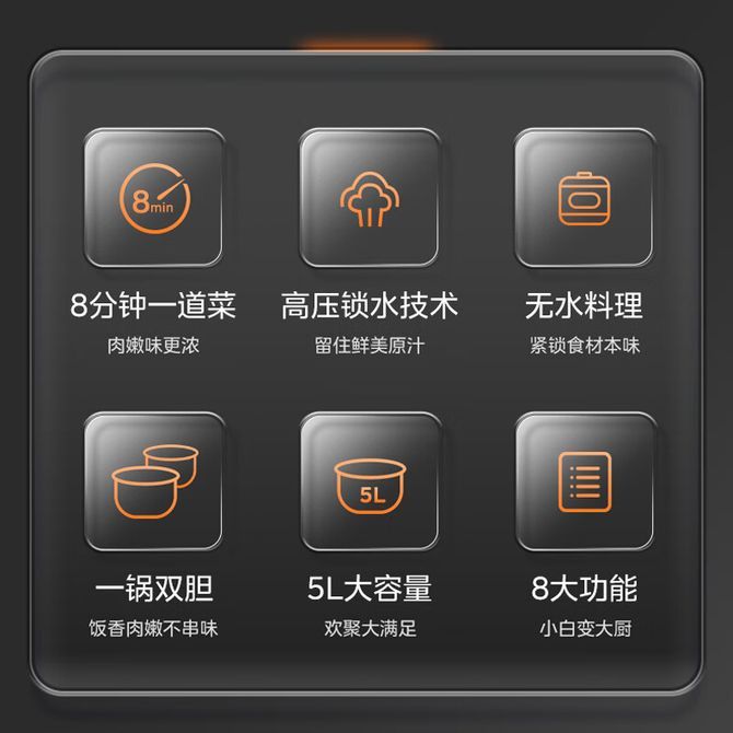 组合销售 产品介绍 产品规格 售后服务 产品咨询 发现好货 苏泊尔(SUPOR)电压力锅 6升大容量 智能触控 球釜双胆 开盖收汁 一键排压 SY-60YC8001Q 高压锅 16900 里程 苏泊尔(SUPOR) 5L电压力锅家用电高压锅双胆高压电饭锅煮饭智能预约 SY-50YC8186 11300 里程 美的/Midea 电压力锅 【一锅双胆】5L全自动家用智能预约 上蒸下煮 不粘双胆煲汤炖肉 YL50Q3-451 10900 里程 美的/Midea 电压力锅 【双胆】5升大容量电饭煲全自动智能饭锅多功能高压锅 24小时智能预约 MY-E523 10400 里程 九阳/Joyoung 电压力锅5L家用电饭锅压力煲电高压锅煮饭锅电饭锅电饭煲全自动智能预约 Y-50C31 11000 里程
