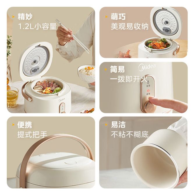 美的/Midea 电饭煲 1.2L小容量家用白玉晶釜上盖可拆卸微压智能多功能 MB-JA122 上盖可拆卸;一键开盖;200W小功率; 兑换价格 5000 里程 会员卡别 终身白金卡 白金卡 金卡 银卡 普通卡 儿童卡 服务 由 小枫叶专营店 发货并提供售后 颜色: 杏色 购买数量: 件 库存件 配送地址: 立即购买 加入购物车 成功添加到购物车 关闭 购物车共有 种商品 总金额为: 组合销售 产品介绍 产品规格 售后服务 产品咨询 发现好货 苏泊尔(SUPOR) 电饭煲电饭锅4L大容量 不粘内胆4-6个人前置大屏面板24小时预约上蒸下煮多功能家用智能SF40FC0063 8300 里程 奥克斯/AUX 电饭煲3L电饭锅 2-3人小型预约智能电饭煲VK-309F2 5100 里程 苏泊尔(SUPOR) 迷你电饭煲家用电饭锅2-3人3L小容量蓝钻不粘内胆快煮饭功能智能预约小型多功能SF30FC0187 6100 里程 美菱/MELNG 电饭煲3L触控式预约定时MF-LC3005 4400 里程 苏泊尔(SUPOR) 煮饭煮粥智能预约多功能一锅多用小型微压电饭锅30FC0187 7200 里程