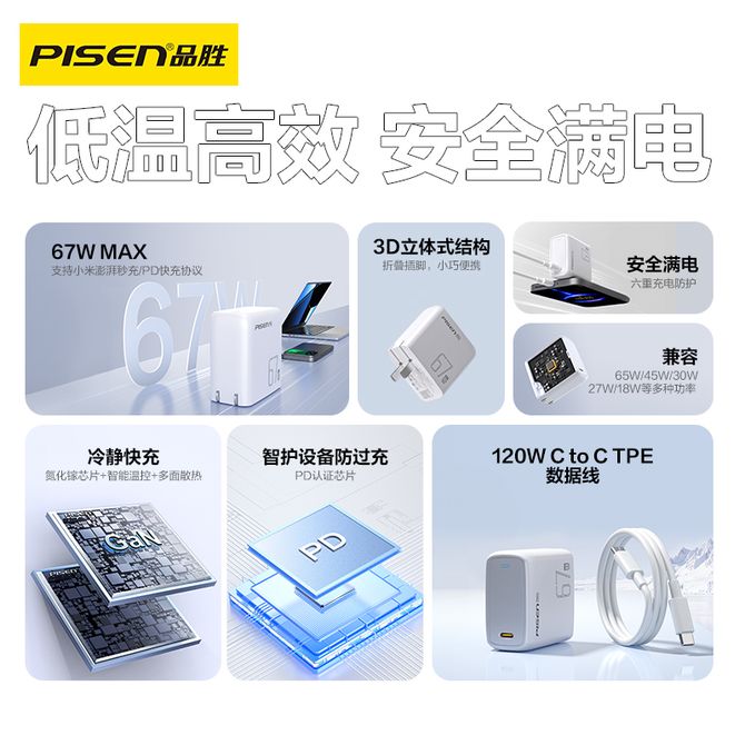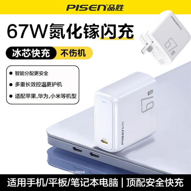 品胜/Pisen 67W氮化镓充电器PD65W插头Type-c快充支持小米67W澎湃秒充充电头适用苹果iPhone17promax/16华为手机笔记本电脑