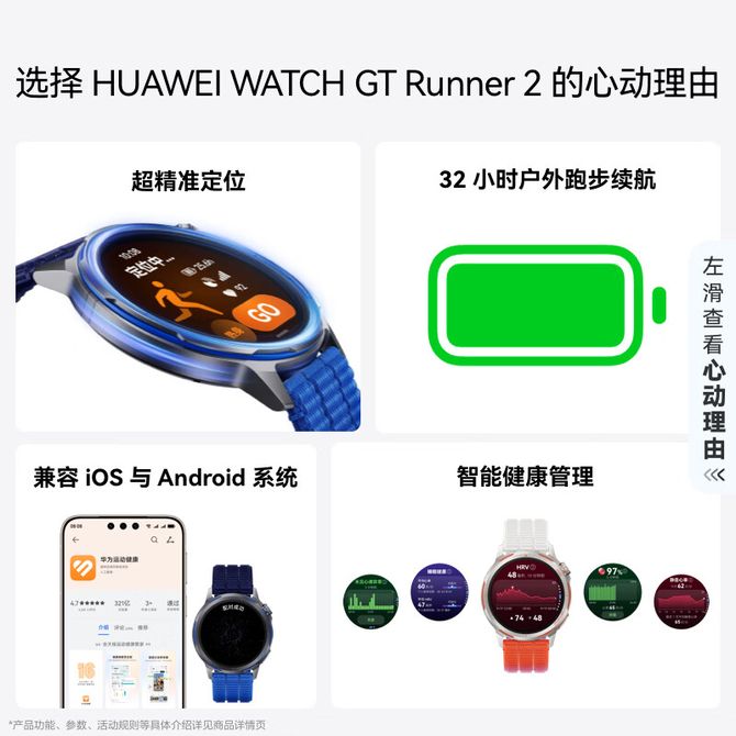 华为/Huawei WATCH GT Runner 2 驰光蓝 华为智能跑步手表 超精准定位 专业马拉松模式 超轻薄钛合金表体 智能健康管理 超精准定位 专业马拉松模式 超轻薄钛合金表体 智能健康管理 兑换价格 112600 里程 会员卡别 终身白金卡 白金卡 金卡 银卡 普通卡 儿童卡 服务 由 美佳润鹏 发货并提供售后 颜色: 橙色 黑色 蓝色 购买数量: 件 库存件 配送地址: 立即购买 加入购物车 成功添加到购物车 关闭 购物车共有 种商品 总金额为: 组合销售 产品介绍 产品规格 售后服务 产品咨询 发现好货 纽曼 多功能蓝牙通话智能运动手环手表i19 5500 里程 小天才 电话手表 D3 儿童智能电话手表 小学初中生男女孩精准定位防水手表 高清视频通话4G 34700 里程 小天才 电话手表 D3蓝色 儿童智能电话手表 小学初中生男女孩精准定位防水手表 高清视频通话4G 34700 里程 爱国者(aigo) 智能手表 V8旗舰版 黑色/银色 男女通用款健康监测心率多功能通话圆盘运动手表 17400 里程 华为(HUAWEI) 手环9 标准版 智能运动手环 轻薄舒适睡眠监测心律失常提示 适用华为鸿蒙安卓苹果ios系统 12300 里程