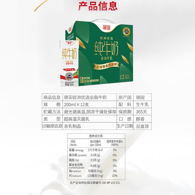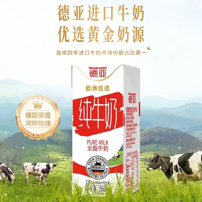 德亚/Weidendorf 全脂牛奶200ml*12礼盒 欧洲优选(黄金奶源带)浓醇营养好牛奶 好奶源优选全球黄金奶源带 兑换价格 3000 里程 会员卡别 终身白金卡 白金卡 金卡 银卡 普通卡 儿童卡 服务 由 壮乡优品生活馆 发货并提供售后 规格: 礼盒 购买数量: 件 库存件 配送地址: 立即购买 加入购物车 成功添加到购物车 关闭 购物车共有 种商品 总金额为: