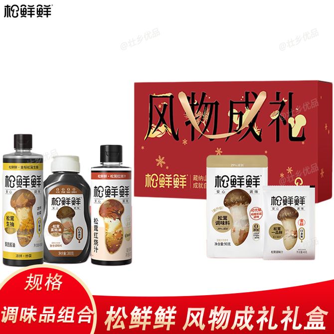松鲜鲜 风物成礼礼盒 调味品礼盒 松茸调味汁松茸调味料松茸一品鲜红烧汁素蚝油礼品组合礼盒 松茸提鲜,点亮家常百味 兑换价格 3900 里程 会员卡别 终身白金卡 白金卡 金卡 银卡 普通卡 儿童卡 服务 由 壮乡优品生活馆 发货并提供售后 规格: 礼盒 购买数量: 件 库存件 配送地址: 立即购买 加入购物车 成功添加到购物车 关闭 购物车共有 种商品 总金额为: